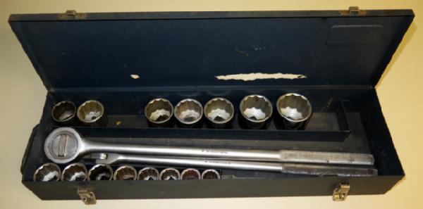 used set, but still looks good, missing the 1 5/8" socket, no paper in lid, box has wear, not perfect, but hard to find set