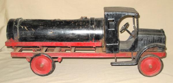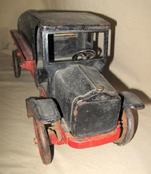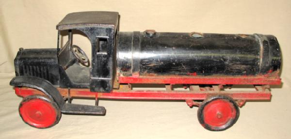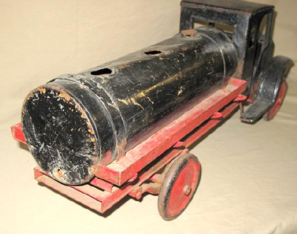 pressed steel wheels, tin grill, has quite a few dings & dents in the tank and missing the caps, good one to restore