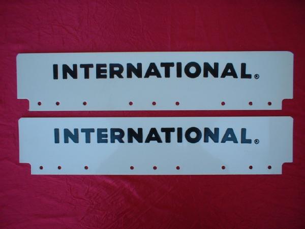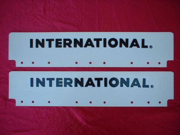 each is 5"x24", die cut w/ INTERNATIONAL logo heat stamped into, both sets are nice and NOS, one set has minor wear, choice set, Internet takes 2x the money