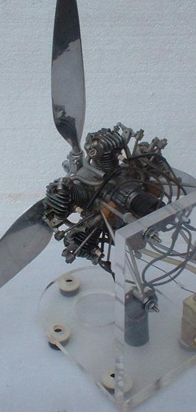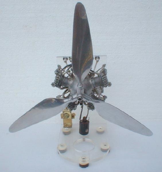Rare M-5 radial 5-cylinder, 4-stroke gas engine. Patterned after Kenner 5-cyl engine made before WWII. Made by Burgess Battery CO. Very nice & scarce, original 14 1/2" metal morton 3-blade adjustable pitch propeller. Original fabricated steel engine mount, correct tiny Champion V-3 spark plugs, the smallest plugs Champion ever built. Ignition coil and small brass fuel tank are mounted onto the base of the acrylic display stand. Should be in running condition.