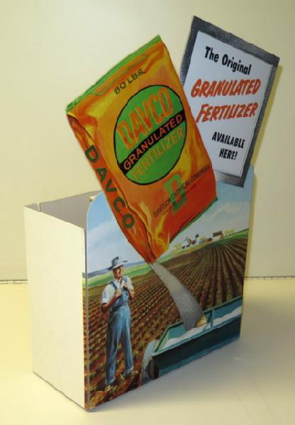 Super piece, made of heavy cardboard, super color and graphics; has a wheel inside with real granules of fertilizer that spins to look like the fertilizer is coming out of the bag; never used, cord is still wrapped from the factory! 17.5" tall, 13" wide; super piece