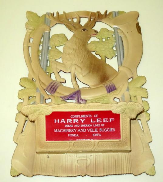 Beautiful piece! 15"x10", has a piece that sticks out that was designed to hold envelopes I believe; advertises "Compliments of Harry Leef--Deere & Emerson Lines of Machinery & Velie Buggies--Fonda, IA". No date or calendar pad, but has to be 19-teen's era. Beautiful condition overall, probably 1 of a kind!