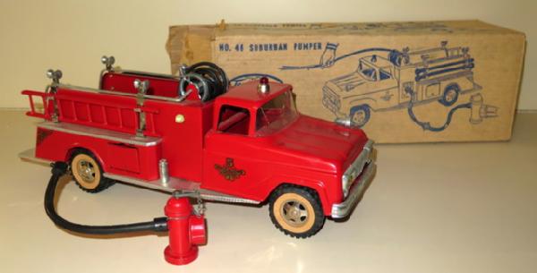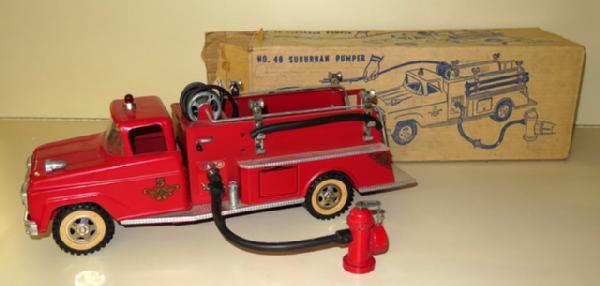 Near mint toy, includes the hydrant, one of the hoses is still attached and the other hose has an end broken off, box is complete with some light wear and water stains, overall a very nice example