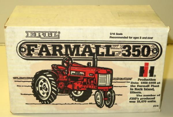 Fantastic Farm Toy Auction 15 Ohio Street, Wakonda, SD 57073 Super collection of OLD, boxed Toys and high-quality customs! Catalog | Terms of Auction | Print Catalog Catalog | Terms Back to Catalog #817 – IH Farmall 350 nf C.E. 1/16th scale NIB More Details NIB Location: 15 Ohio Street, Wakonda SD, 57073 High Bid: $20.00 – alltoys bidding history Bidding has closed on this lot Back to Catalog
