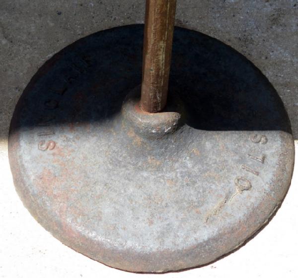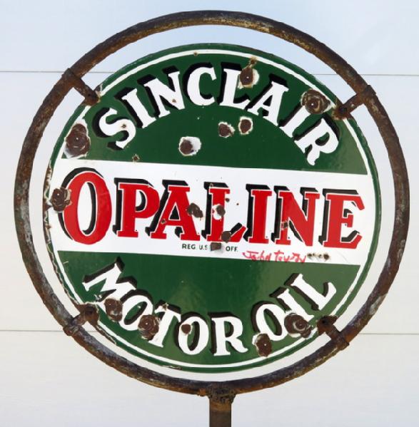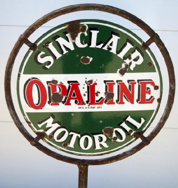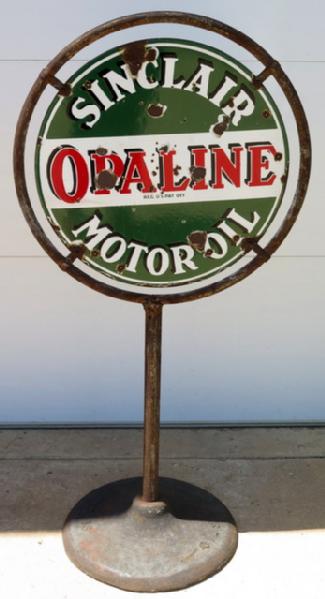 24" diam sign, both sides have heavy chips, but good color and gloss, includes a Sinclair Oils Case Iron base with large letters