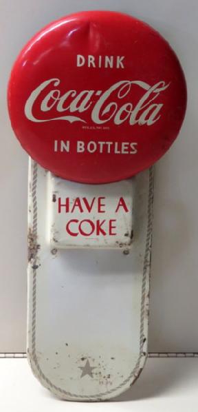 no calendar pad, 19"x8", has some rust and wear, small dent in the top of the button, smallest button sign made by Coke