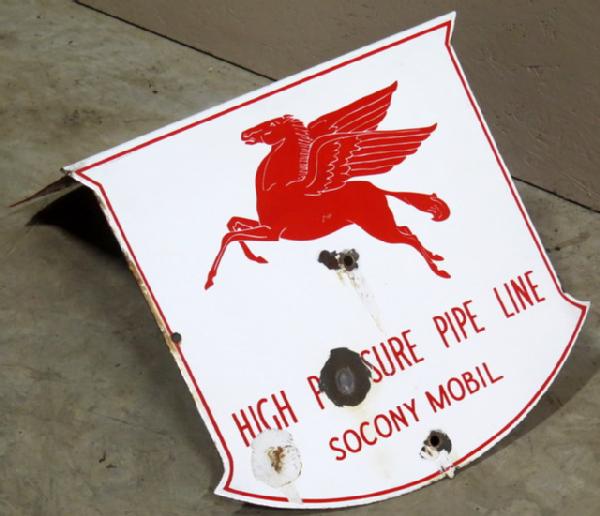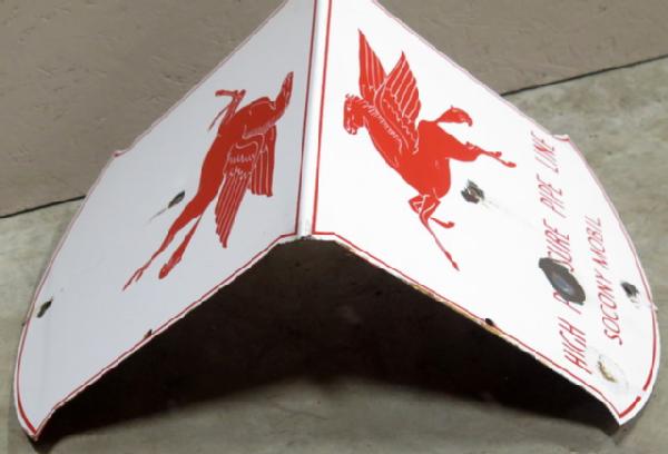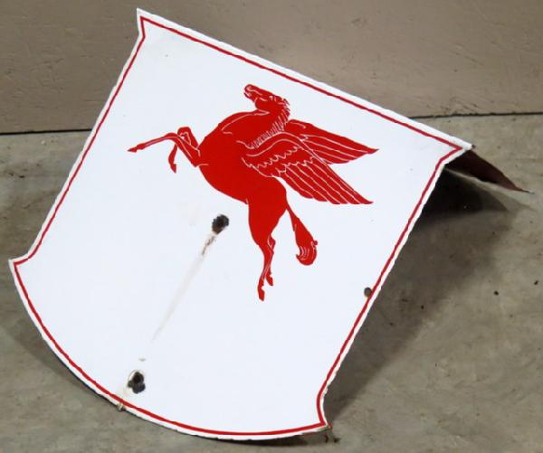 14.5"x15", both sides have some bullet marks, scarce small Mobil sign, designed to be folded over, could be made into two signs for easier display