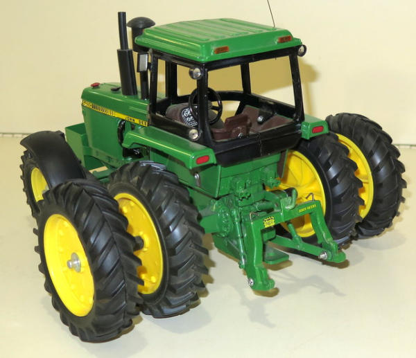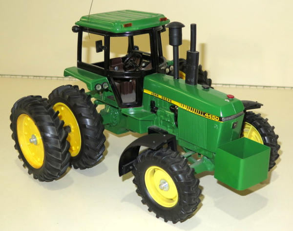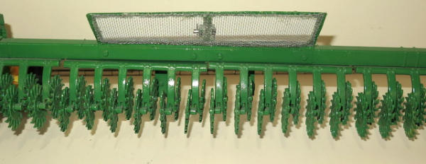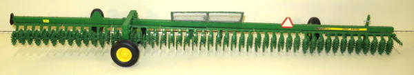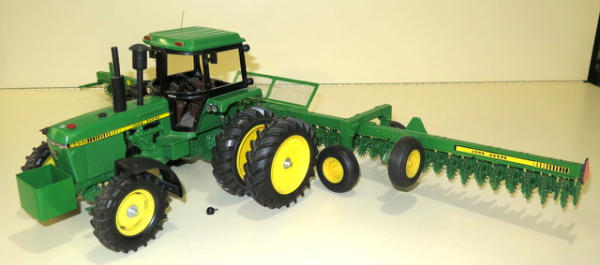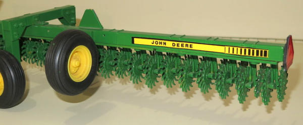 Ertl Tractor that has been heavily customized with 3pt, quick hitch, lights, mirrors, rock box and more; Rotary hoe is made from Ertl parts with a custom transport, nice set