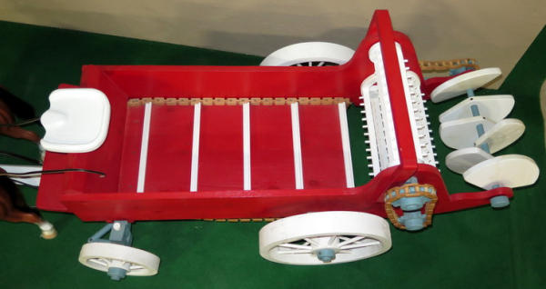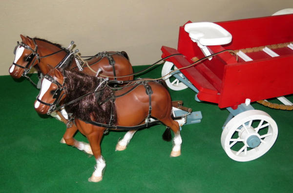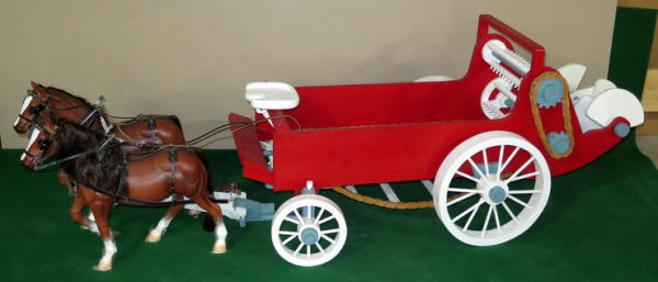 This is a great piece, all hand built from wood spreader, when hitched, it's about 7' long! Horses are plastic horses with full custom harness, another piece that you will be proud to own!
