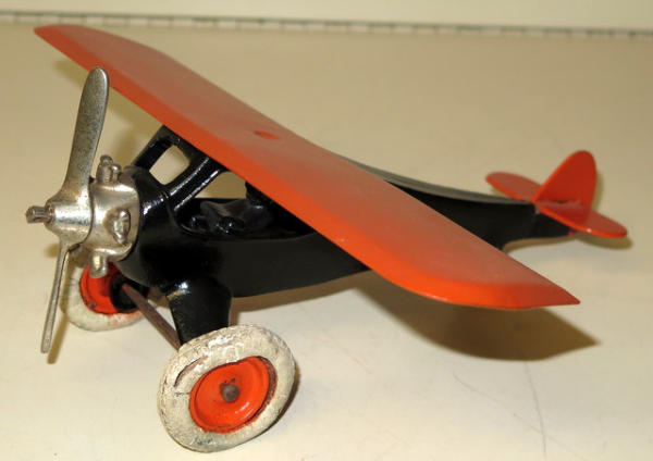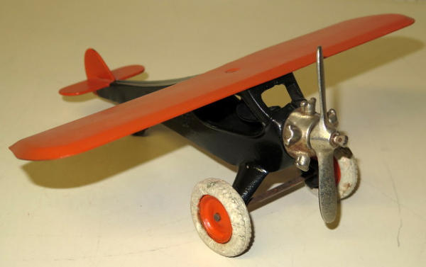 9" long, 11" wingspan, wing is tin, looks like tailfins have been repaired, has the driver inside