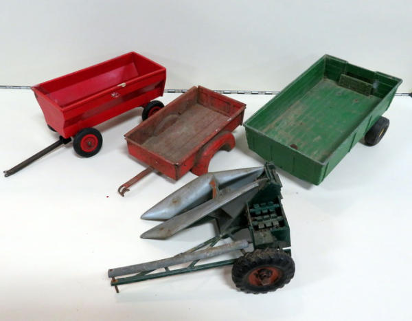 NI picker by topping; Farmall wagon by PM; Tru-Scale pickup bed trailer & JD wagon; all have wear; all for one money