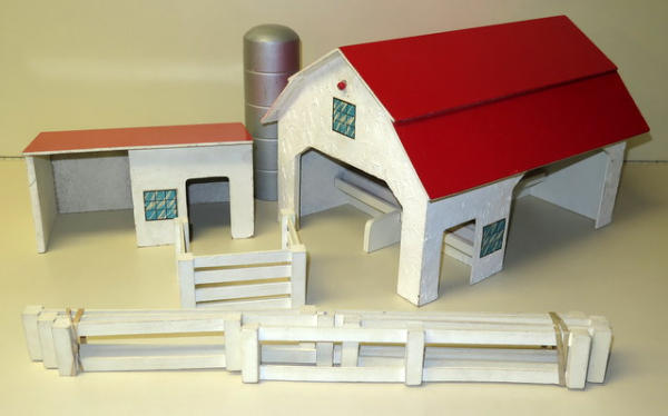 stamped on the bottom, matches the horse stable earlier in the auction, barn is 15"x12", nice original set, no box
