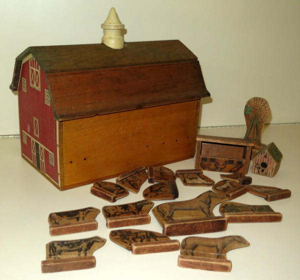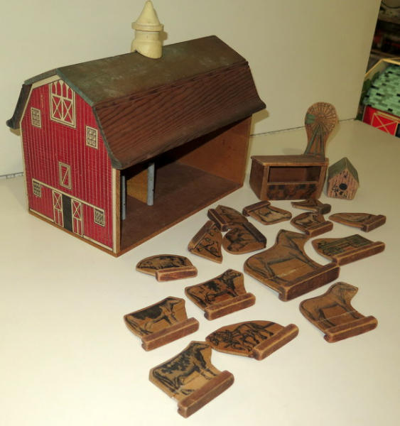 barn is 13"x8.5" has some wear and fading to the roof, don't know maker
