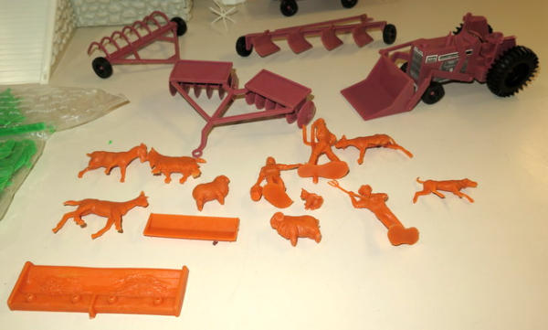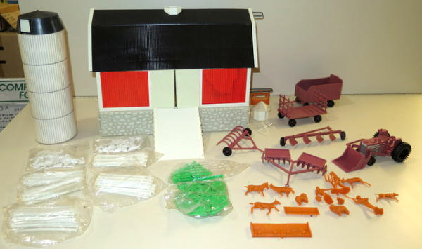 Barn, Shed, Silo, Chicken house and more; barn is 15"x8", plastic and wood, no box; 2-Boxes of Toys, includes Machine shed too