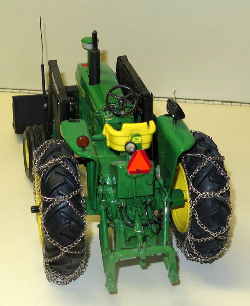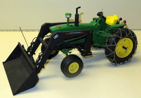 Ertl tractor that has been heavily customized with levers, fender radio, 3pt, quick hitch, Hyd Outlets and more, Loader is SCRATCH BUILT (Not a repainted Ertl), super detail with all the hoses, nice piece