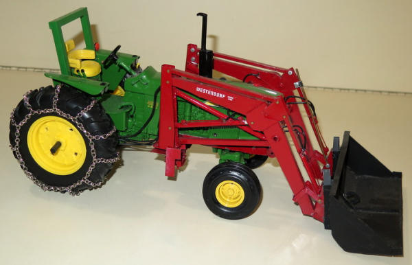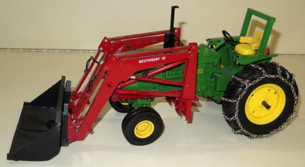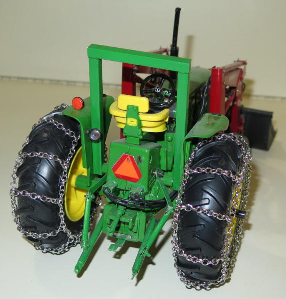 Ertl Tractor customized with tire chains, levers, 3pt, and more; Loader is 100% scratch built and nicely done with all the lines, nice piece