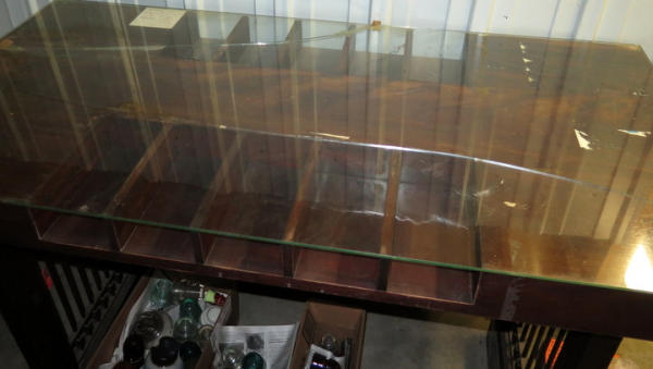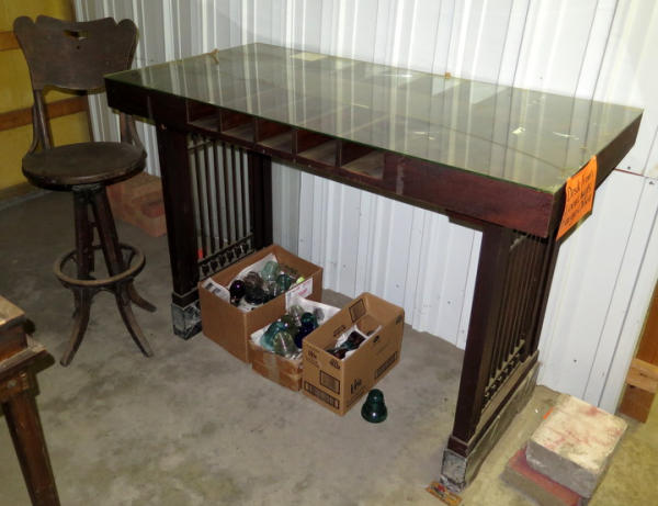 Oak Desk with glass top and brass decorations on the side, marble base, 60"x30" top, stands 42" tall, includes a matching stool, neat piece