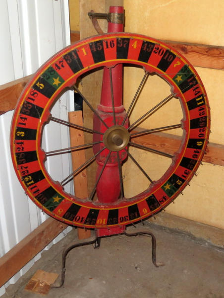 on a stand, has a crack in the wood, nice old red & black paint, 31" diam wheel, about 45.5" tall