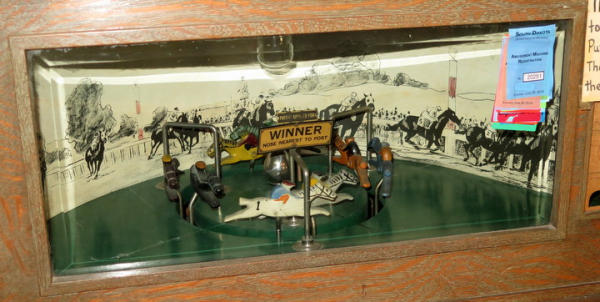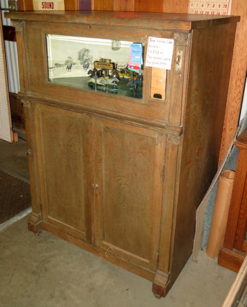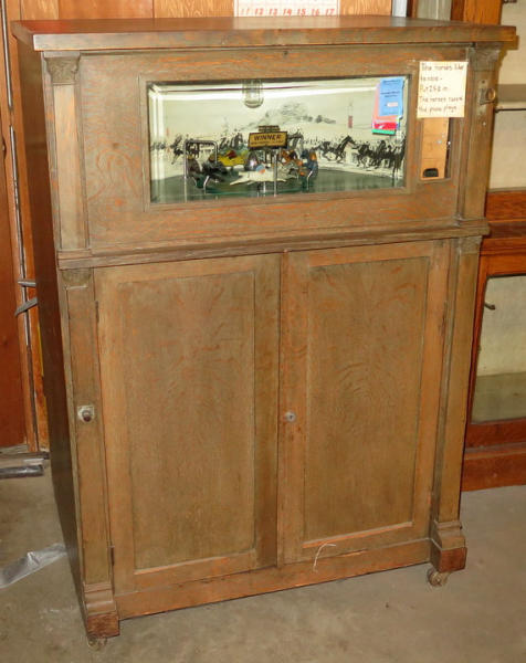 Neat piece, drop ad quarter in the horses race and the piano plays, large cabinet, 52" tall, 37" wide, 26" deep, works good; (doesn't like the cold)