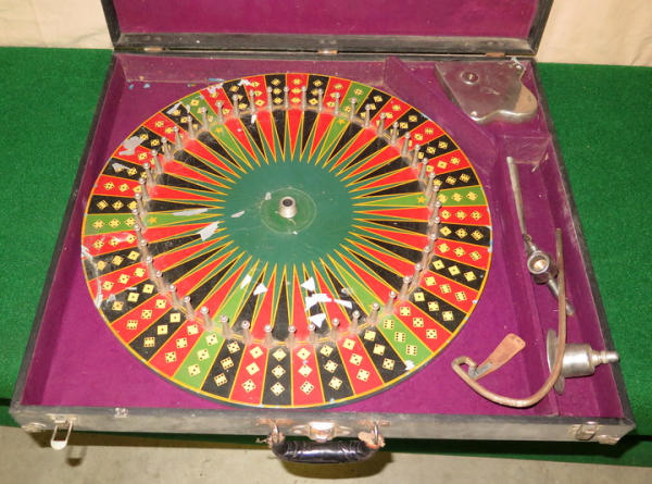 24" diam wheel, neat graphics, but has some large paint flaking and a piece that has been repaired on one side, neat piece, but needs some restoration work