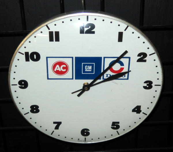 12" across, electric movement was removed and replaced with a battery, looks good overall