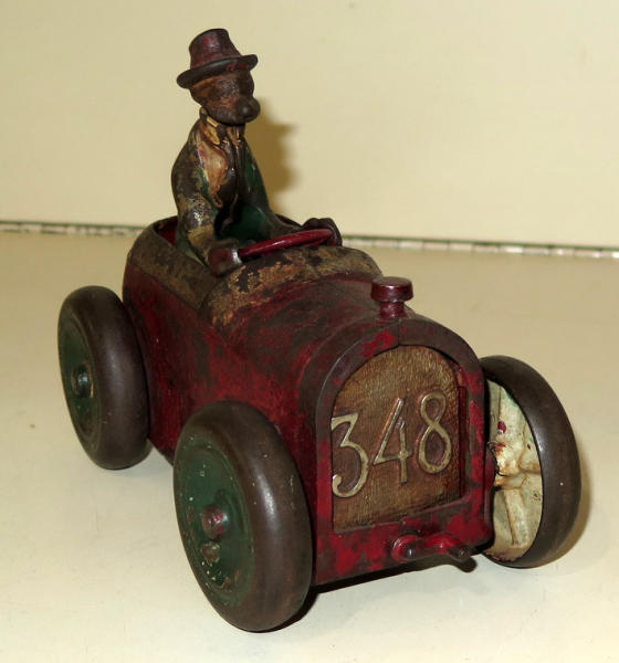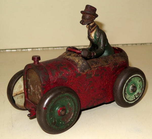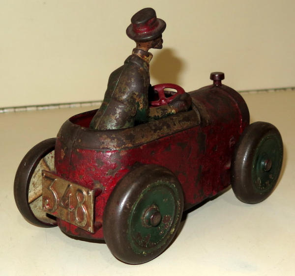 7" long, looks to be all original except maybe the steering wheel, paint on the driver is very heavy worn, car is about 60%, neat toy