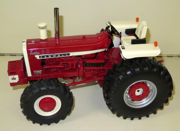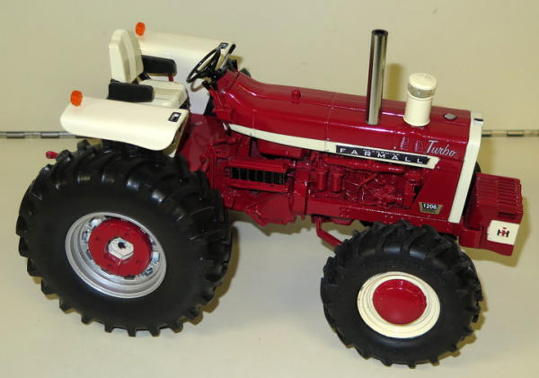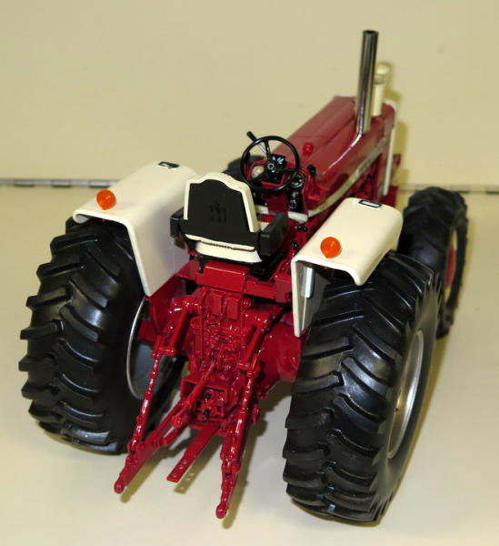 Large Rear tires, 2-sets of rear weights, painted front weights, all levers, 2-bulb & Flasher fenders, large glass bowl air cleaner, chrome straight pipe, motor detail--The MUSCLE tractor of the 1960's!