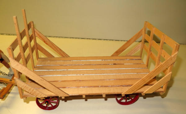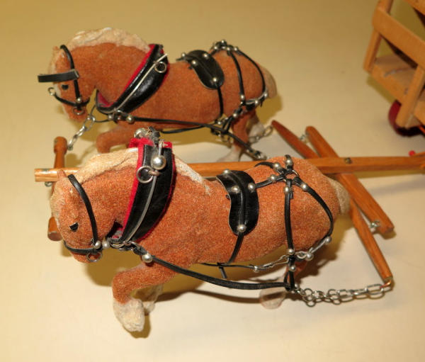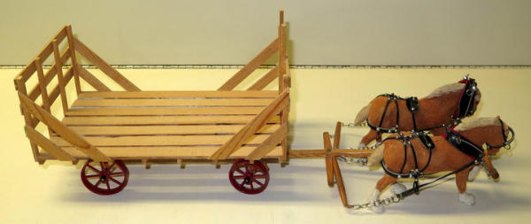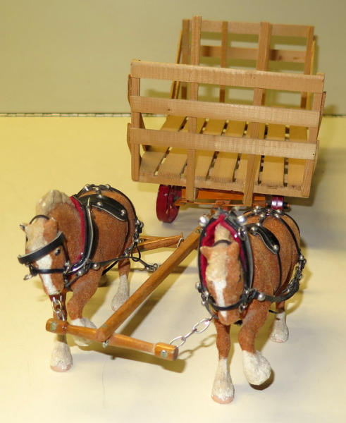 Smaller than 1/16th scale, Wood box, metal gear in MM colors, Flocked horses w/ leather harness, looks good