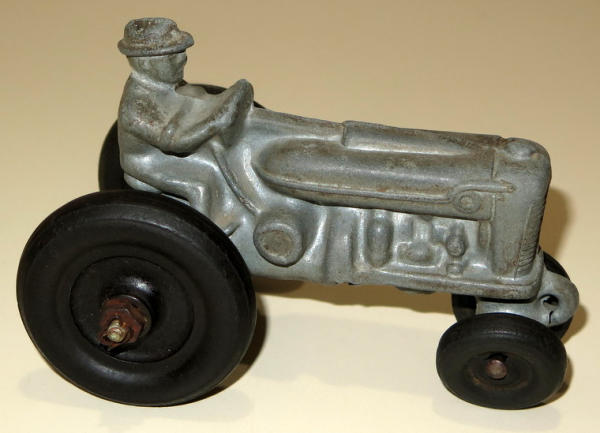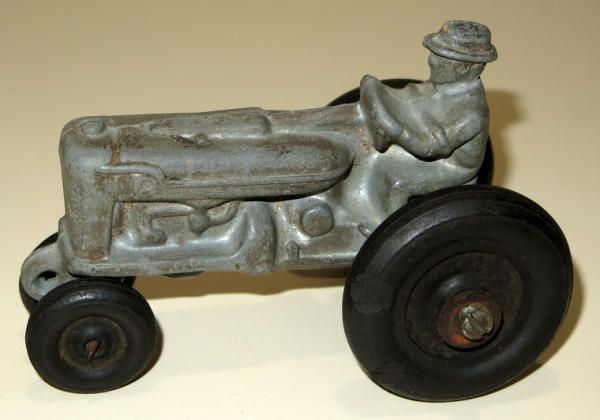 4.5" long, no paint left, not sure on the maker, but I think Hubley