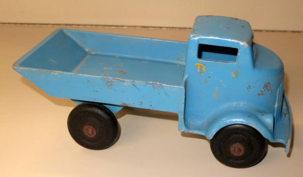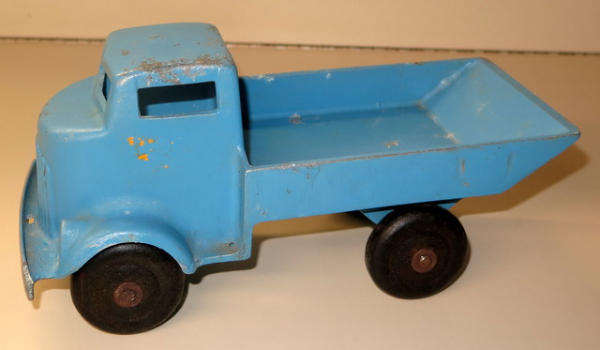 stationary bed, 12" long, has the decal on the cab back; chipped left front bumper, unique toy made in Hollywood, Cali.