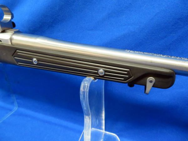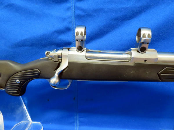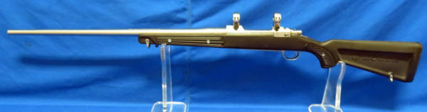 24" Stainless Barrel; fired but only a few times; very nice condition; smooth action; has scope ring mounts; black synthetic skeleton stock; SN#787-57964