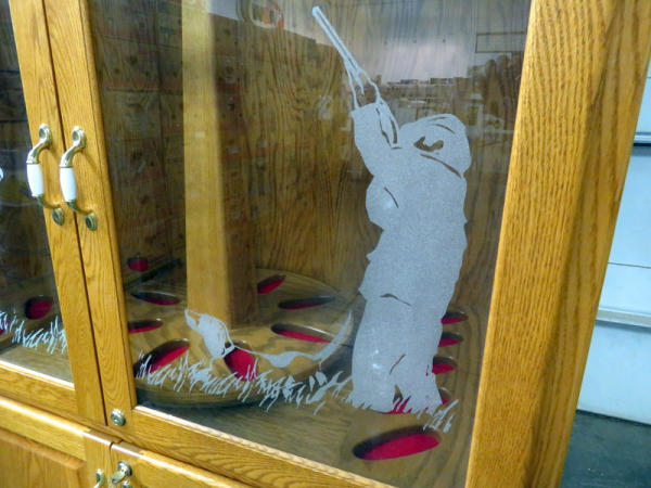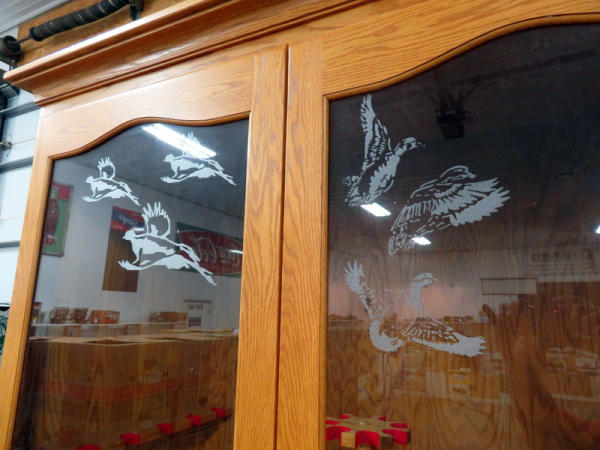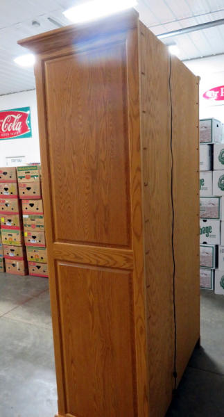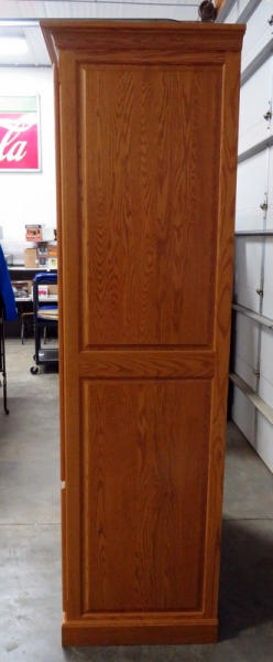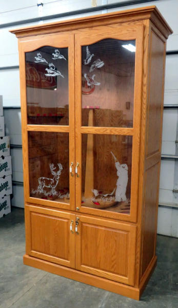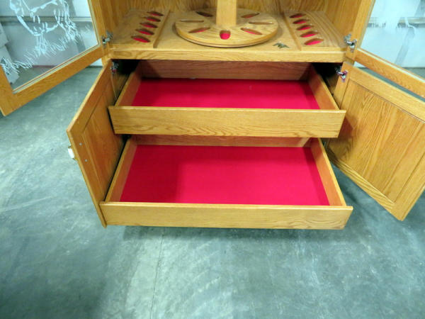 Nearly 8' tall, exact measurements 91"T x 48"L x 25"W; lighted; crown molding, etched glass front; large double drawers on glides to come all the way out; lazy Susan in the middle; holds 18 long guns total; has keys; drawers are large enough to store several pistols or even shorter rifles; this is a very impressive piece and would be a great addition to someone that likes to show off their high grade firearms behind glass! NO SHIPPING, local pickup only!