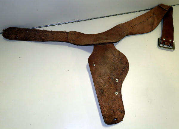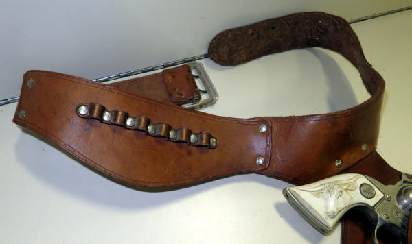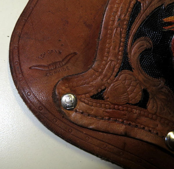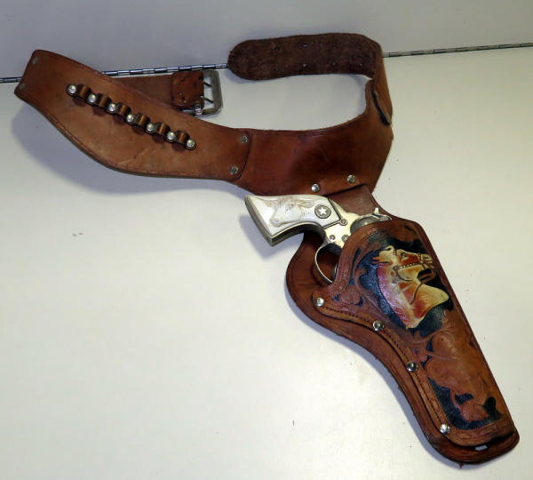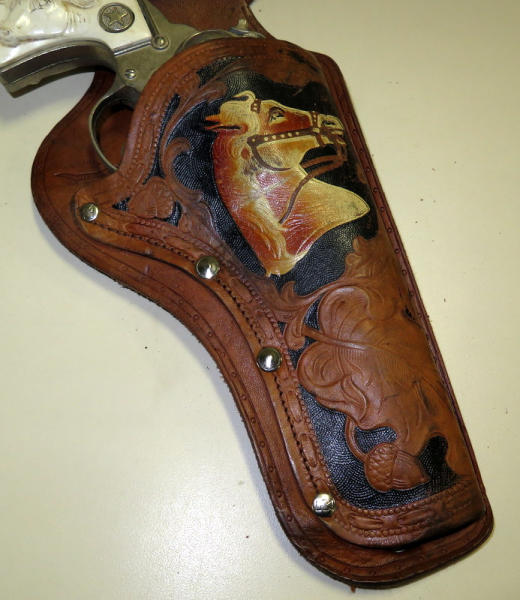 nice leather; great tooling on the holster w/horse head; has Texan Wester gun w/steer head on grips, hammer is broke off gun;