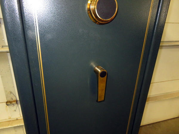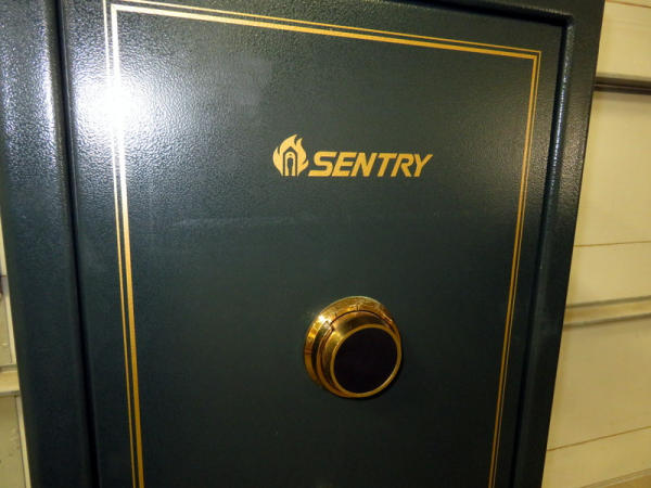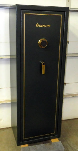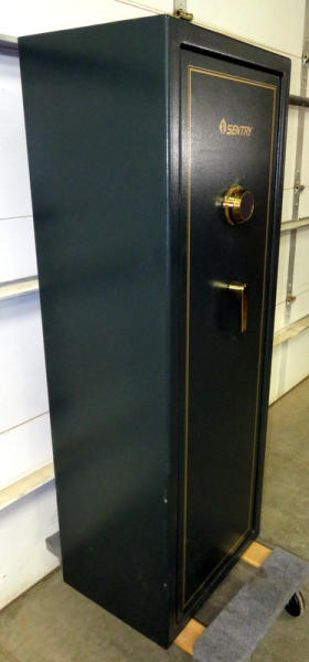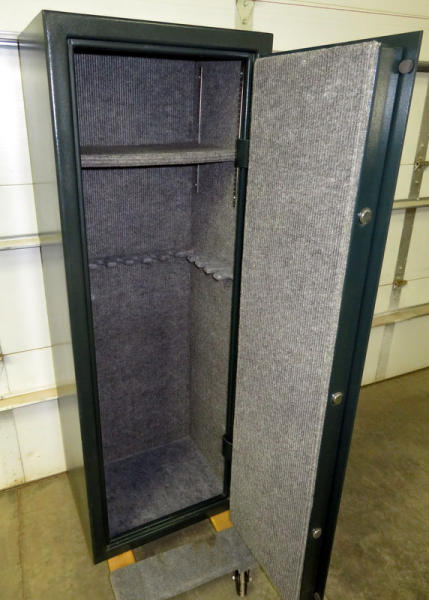 not sure how many claims to hold; but has spots for 14 long guns; one shelf; very nice condition; nice dark green color; dial combination; 59"Tx 21"Lx16"Deep;