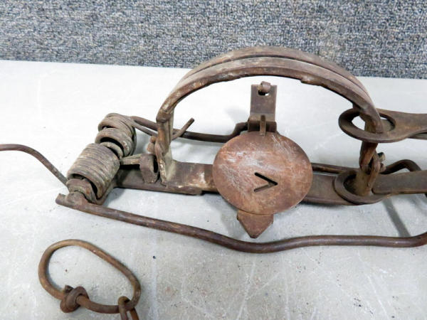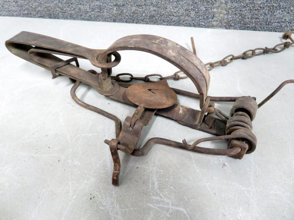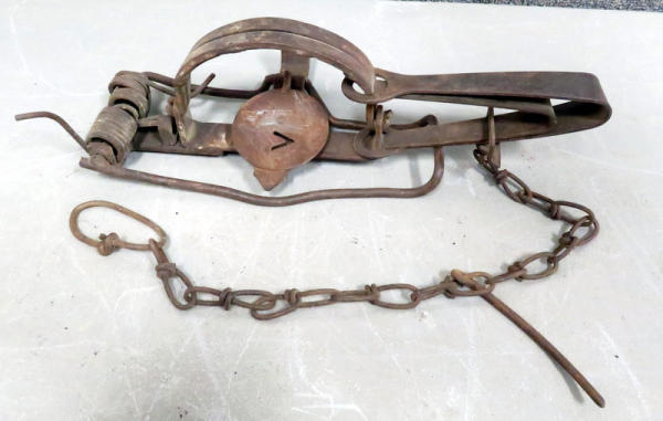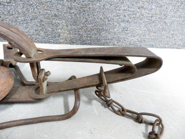 old trap; 13" long; 5" jaws; lightweight chain;