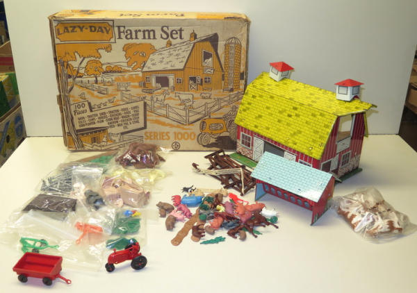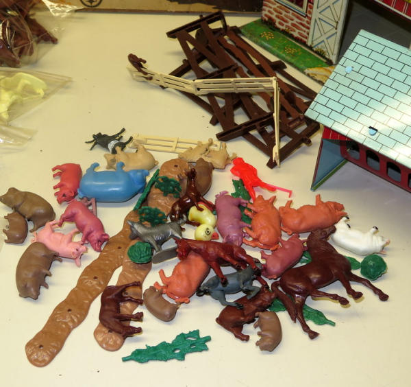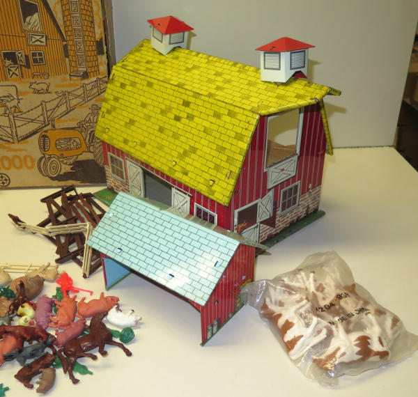 Tin Barn with lots of animals and accessories, played with set, some rust and wear on the barn, no idea if complete or not