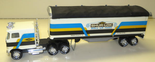 Made by Nylint for Shur-Lock; 1/25th scale, small chip on the back of the cab, has real roll-up tarp, nice piece