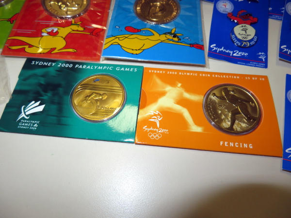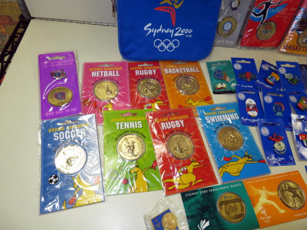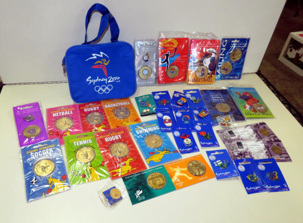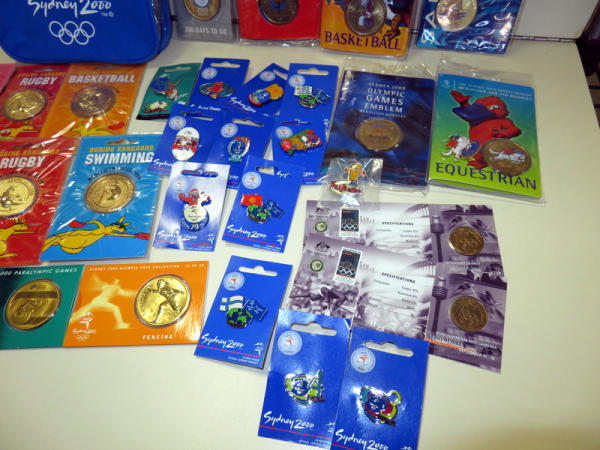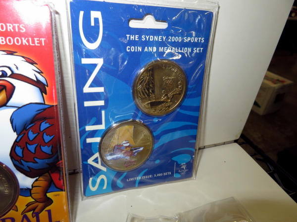 has two $5.00 coins included; several pins and some sports/mascot medallions; includes an Olympic pouch