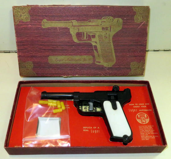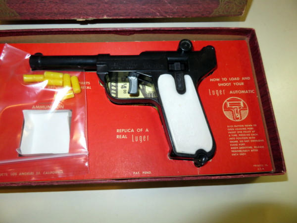 gun is near mint; has a couple plastic bullets; box has some minor wear but over displays very nice; gun is 7" long
