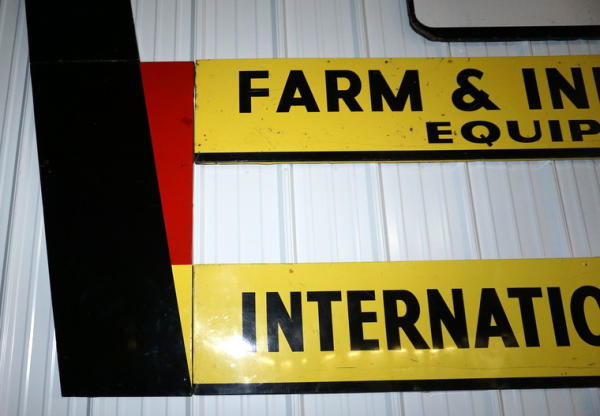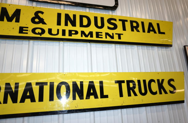 Large piece, all has been used, but great color and gloss, each yellow panel is about 9' long, so all displayed it is about 12'xmaybe 6' tall; has some scattered spots, dings, scratches and dents, but overall is a strong 8 condition; hard to find this sign complete with accent pieces; no shipping, local pickup in Avoca, IA only