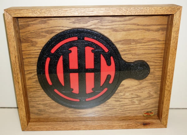 a little pitted, but nicely repainted, in a very nice oak shadow box; this was the bucket holder on very early IHC cream separators, box is 18"x15"
