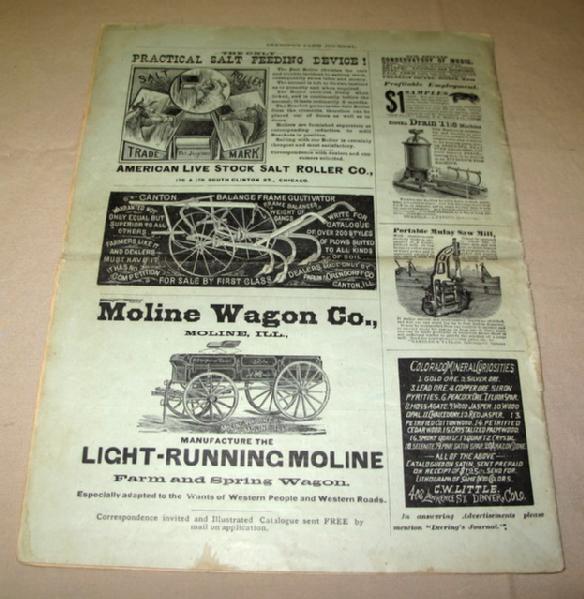 has some wear, but not bad for a 130+ year old newspaper! 20 pages, has other company advertisements including Moline Wagon company