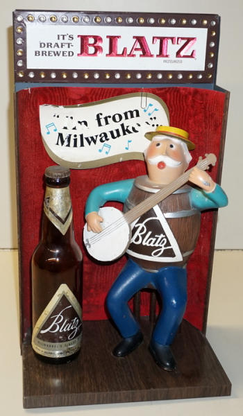 18" tall, 10" ide, metal man, real beer bottle, non-lighted variation, some general wear