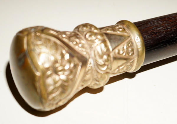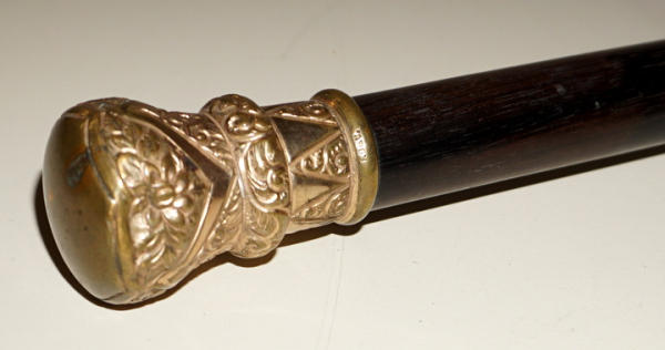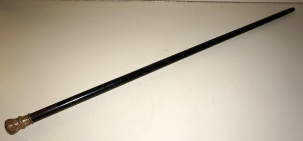 35" long, very nice, probably brass, but ebonized wood, nice & early cane