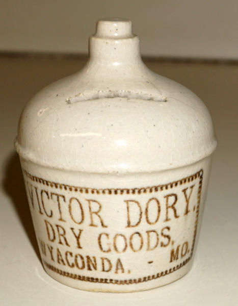 3.75" tall, bottom marked Macomb Pottery; **Updated**hairline crack on the coin slot