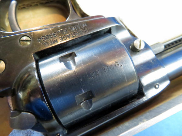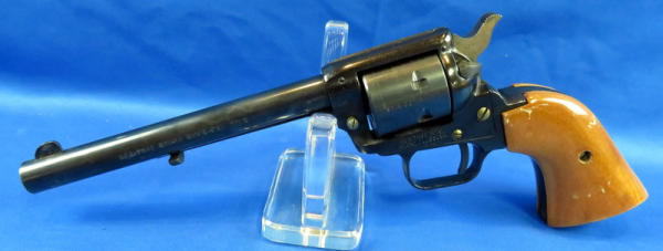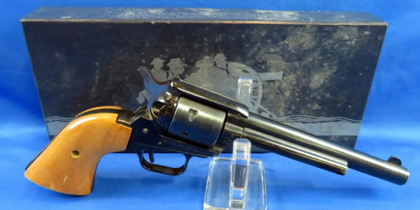 I believe this is unfired, but does have some surface rusting and spotting from storage; 6.5" Bbl.; wood grips; original box has some wear from moisture; includes both cylinders; SN#HR09787