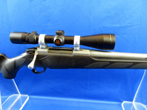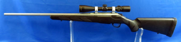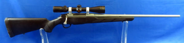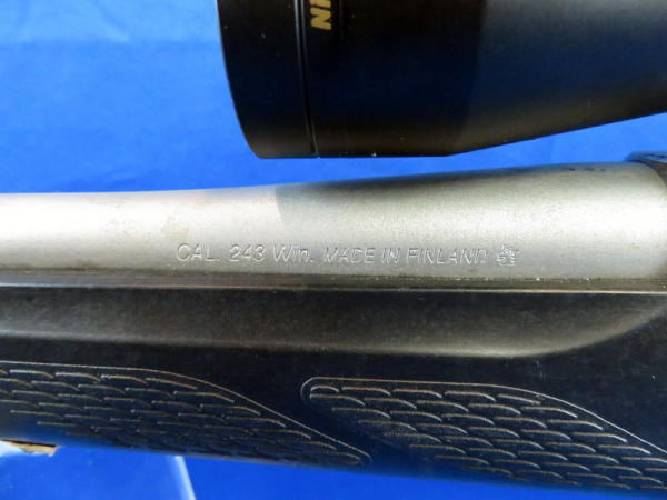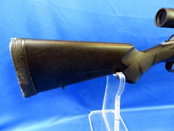 22.5" stainless barrel; black synthetic stock; has a sticky film on the shoulder pad; smooth action; Nikon 3-9x40 scope is clear but needs a cleaning; removable clip; SN#730875