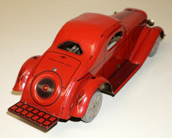 13" long, pressed down on the rare to make it go, works good, clean and nice, 95% condition