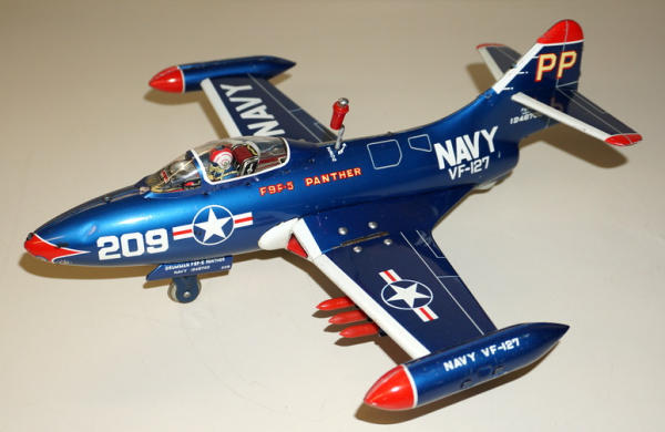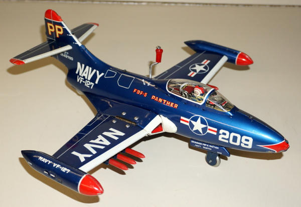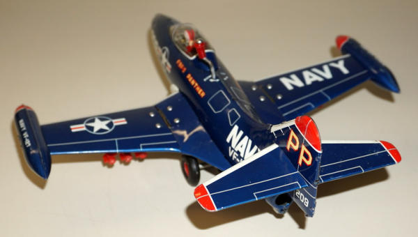 Super color and graphics, 13" long, 12" wingspan, very small dent in the nose, has a crank on the top to raise & lower the wings, nice piece
