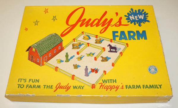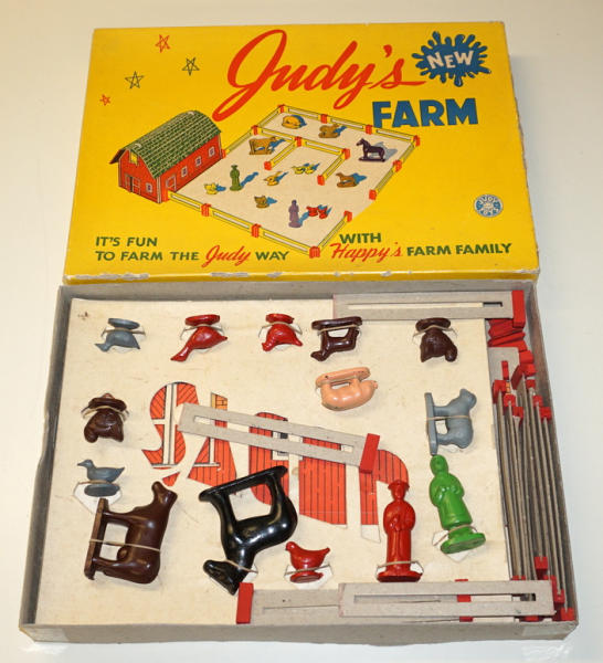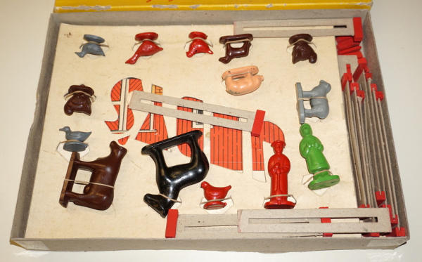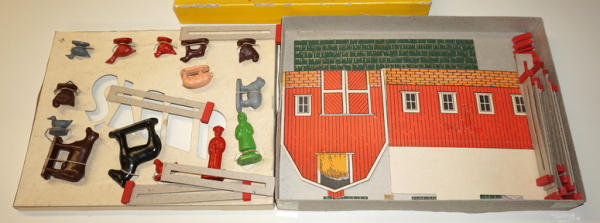 Carboard barn & set w/ hard rubber animals, looks to be pretty well complete, box has some light wear mainly to the edges, box is 14"x10.5"
